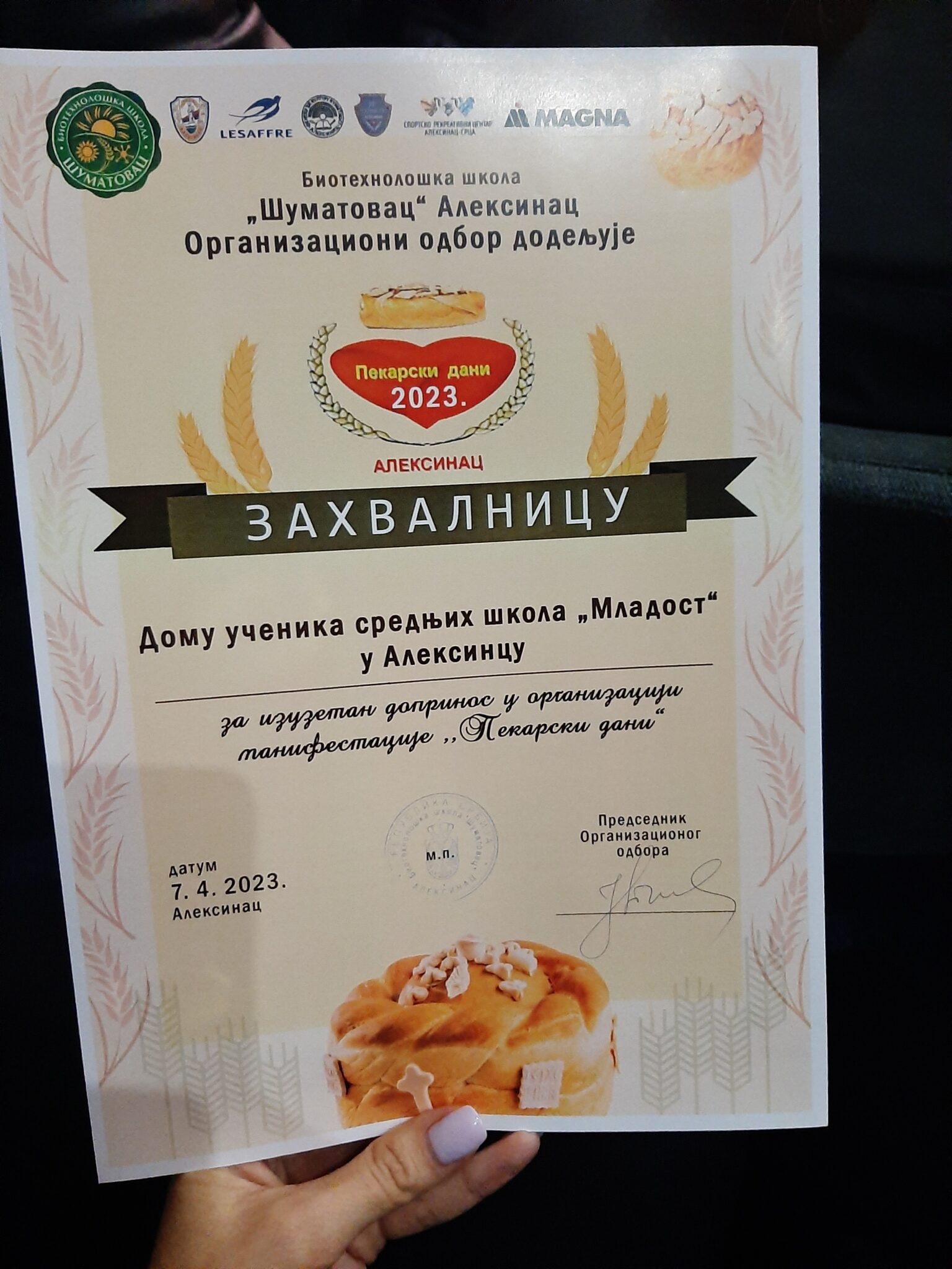 Дом „Младост“ се такође представио и на посебном штанду са пекарским производима, где су биле изложене слатке и слане ђаконије наших ученика, али и запослених. Ученици су показали своју креативност и умеће, и доказали да тимски рад увек доноси добар резултат. Дом је такође добио и Захвалницу за изузетан допринос у организацији манифестације.