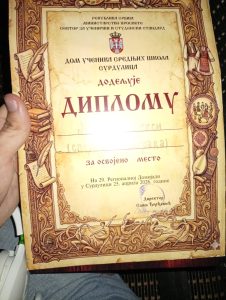 ученика у Сурдулици, наш Дом представио се ученичким радовима на штанду, а ученици су такође учествовали у категорији драмски приказ, етно и народна музика и ликовни рад. Најуспешнији смо били у драмском приказу, где су чланови Драмске секције, Младен Костић, Алекса Јовковић, Павле Рајић, Немања Ђокић, Василије Николић, Анђелија Стојановић и Ива Станојевић, извели представу Бранислава Нушића „Сумњиво лице“, у режији Алексе Токића. Ученик Алекса Јовковић је за улогу Виће освојио специјалну награду за глуму. У категорији Етно и народна музика, Сташа Станковић отпевала је нумеру „Мндрам ја“, уз пратњу Вељка Недељковића на хармоници. Наше ученице Ива Динић, Емина Милојевић и Сара Алексић учествовале су у категорији Ликовни рад, а на штанду Дома ученици су се представили са преко 25 експоната – уметничка фотографија, костимографија, цртеж, слика, графика, издавачка делатност, примењена уметност, вајарски рад, макетарство. Како је све то изгледало, погледајте у галерији фотографија.